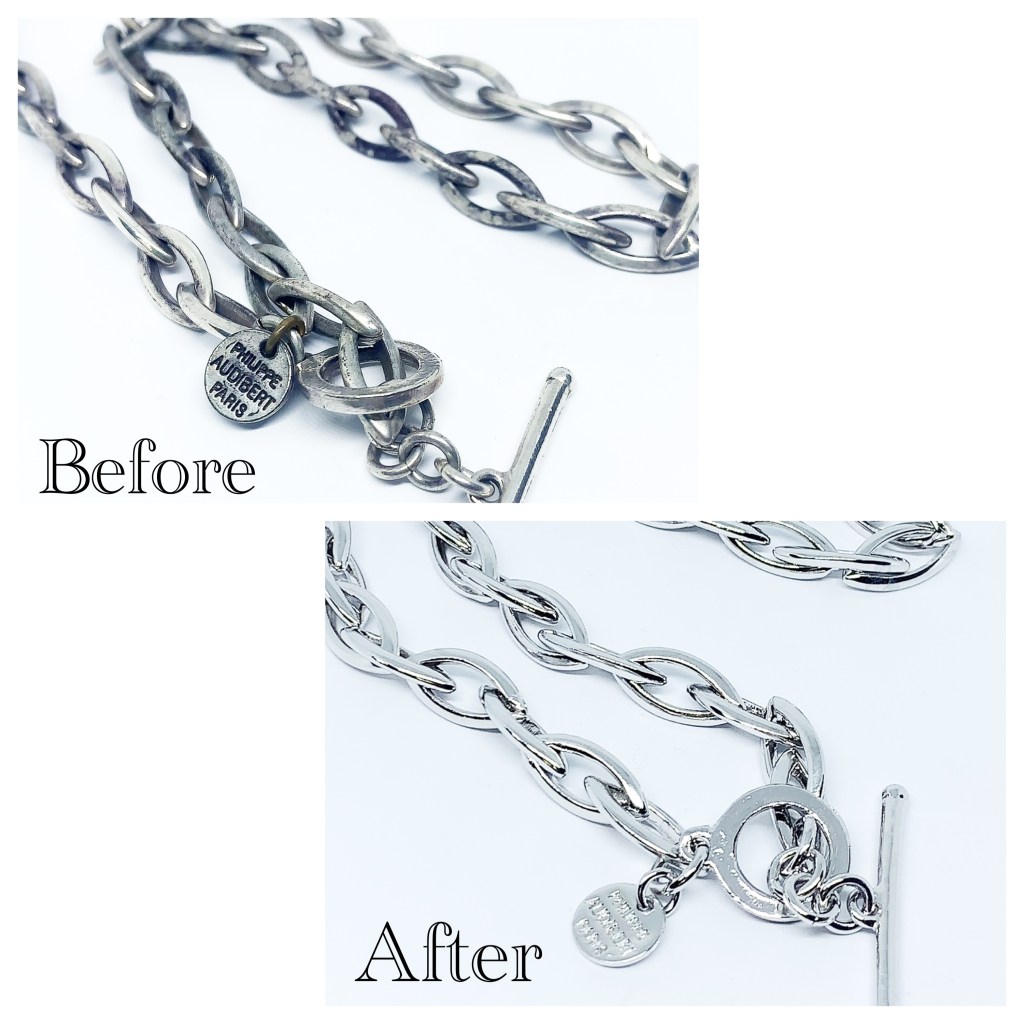 元々の風合いを損ないたくない場合は、専用のシルバー洗浄液+軽く研磨剤の入った布で磨く「簡易クリーニング」もお勧めですが、表面の酸化による黒ずみにのみ反応するので、メッキが剥がれた箇所は綺麗になりません。(簡易クリーニングが有効な場合はネックレスで¥2,500〜)