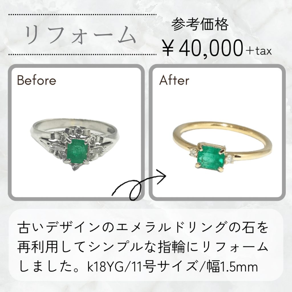 エメラルドと脇のダイヤモンドを再利用してシンプルなデザインの指輪にリフォームしました。