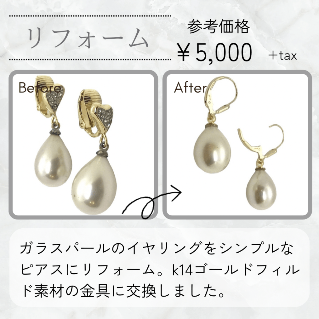ヴィンテージのガラスパールのイヤリングをk14ゴールドフィルドのピアスにリフォーム加工しました。