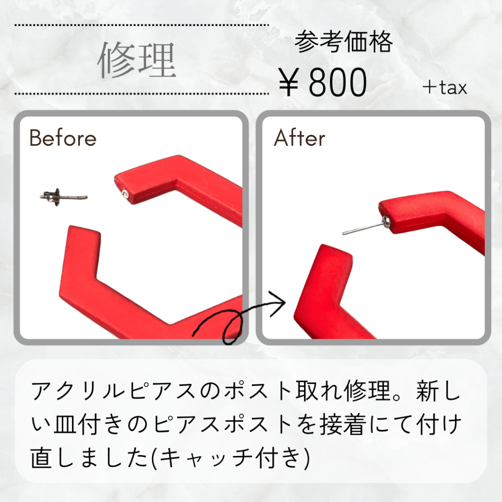 元の取れたポストは強度が弱く再利用できない為、新しい皿付きのピアスポストを接着にてお直ししました。