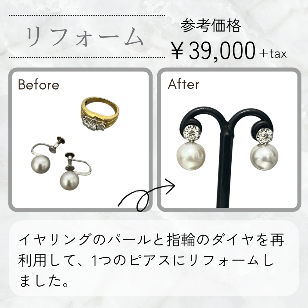 ダイヤを外して残った指輪の枠(K18)と、イヤリング金具(プラチナ)は、下取りが可能なので、リフォーム代金から差し引きして、お得にリフォームも可能です!