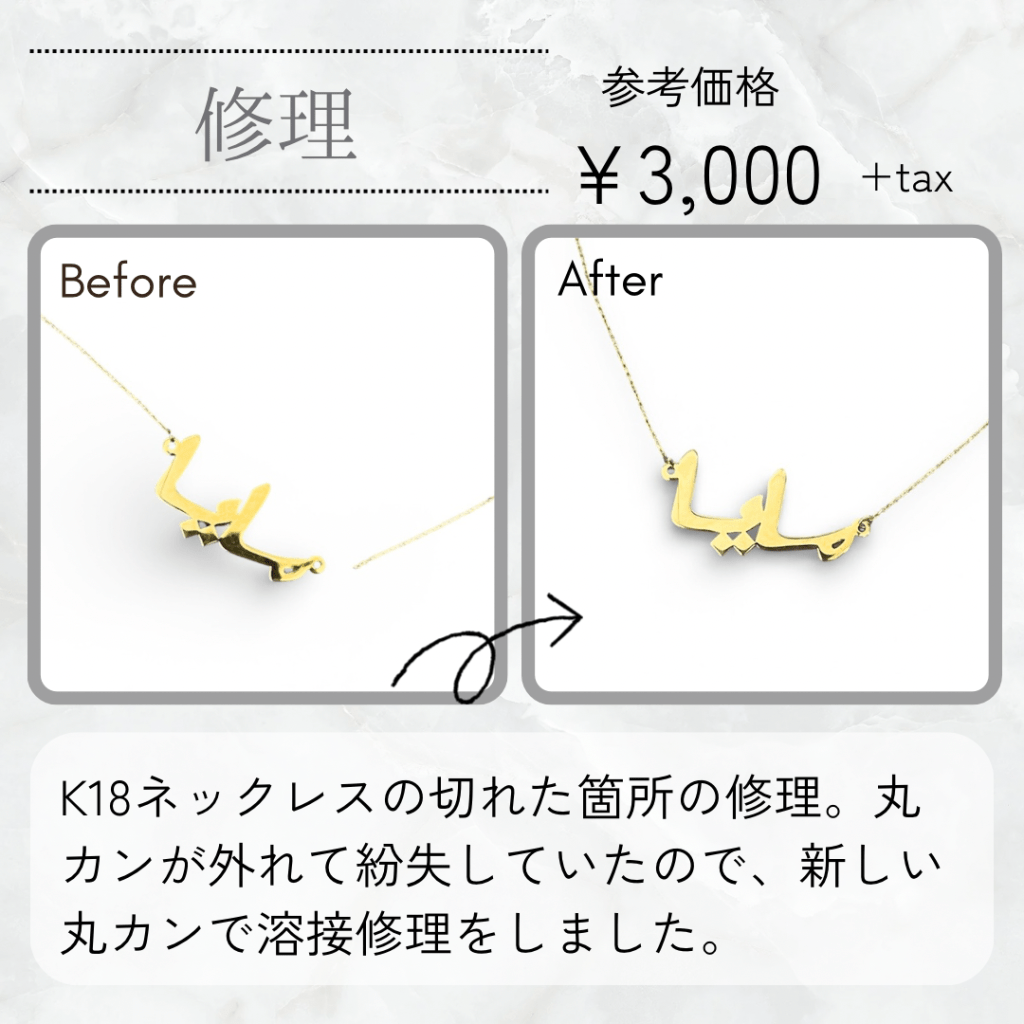 トップとチェーンを繋ぐ丸カンも紛失していたので、新しいk18丸カンを付けて溶接をしてお直しをしました。