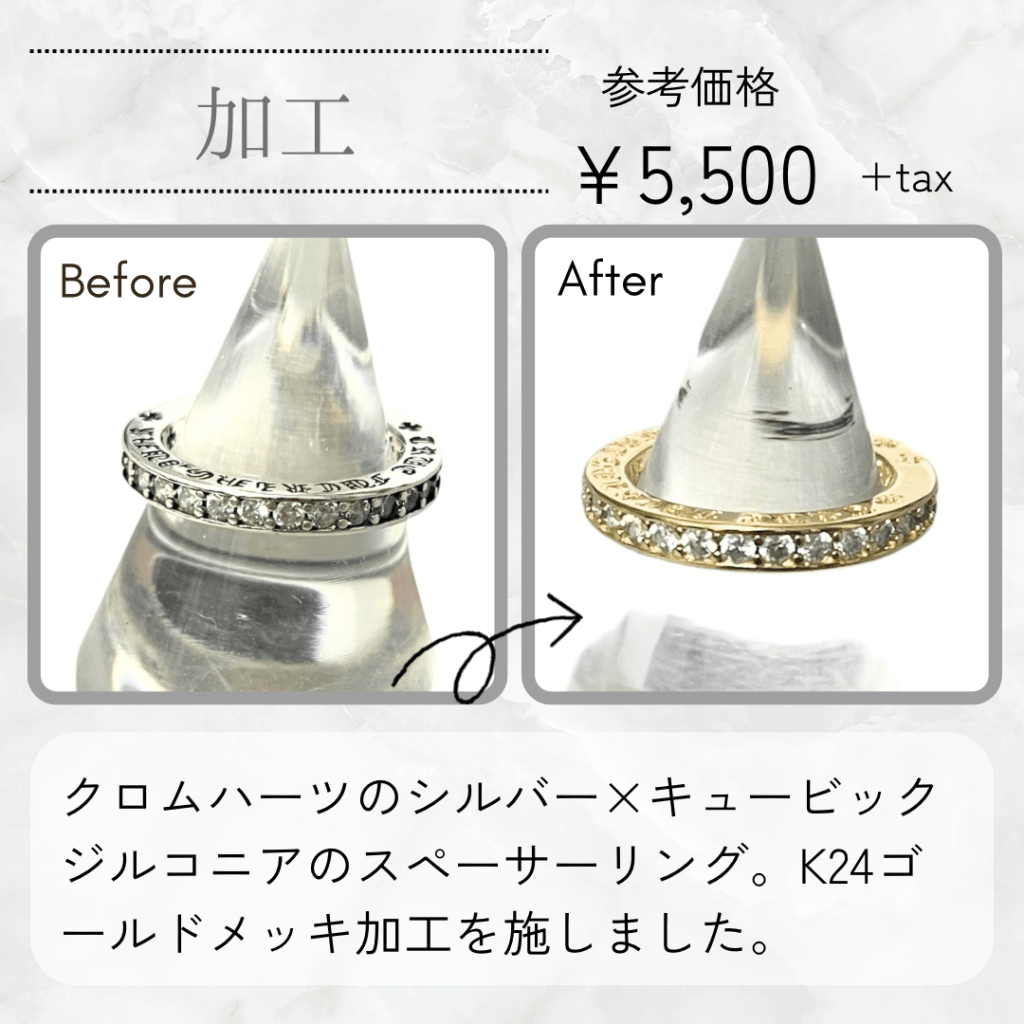 クロムハーツのシルバー925×キュービックジルコニアのスペーサーリングにK24ゴールドメッキ加工を施しました。