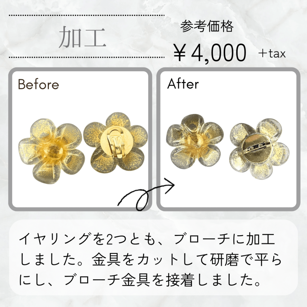 イヤリング金具をカット、平らに研磨してからブローチ金具を取り付けました。