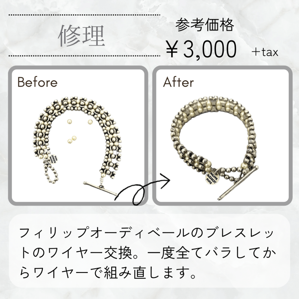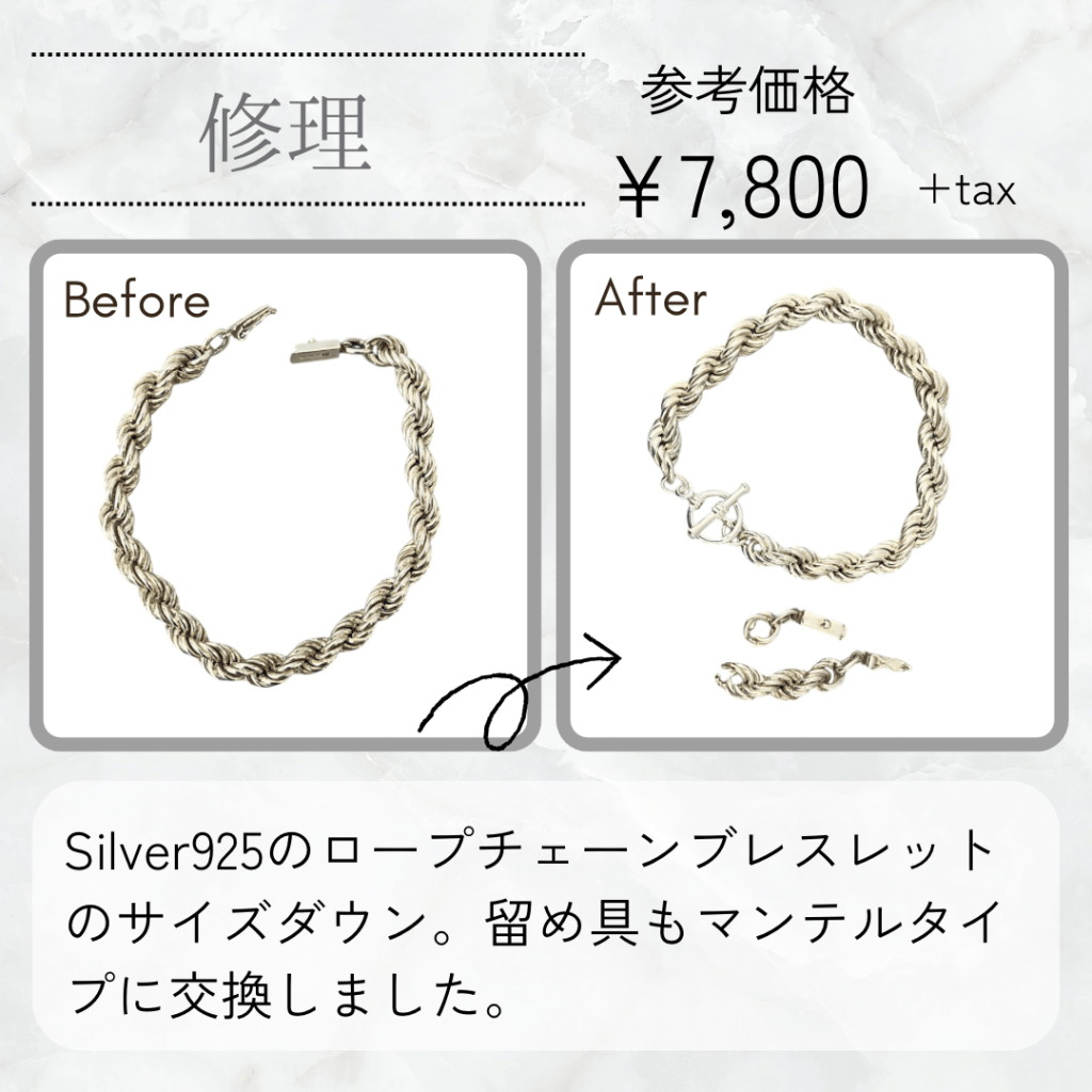 シルバー925のロープチェーンブレスレットを短くサイズダウンしました。チェーンをカットして、切れた部分一つ一つを溶接して繋ぎ直しします。