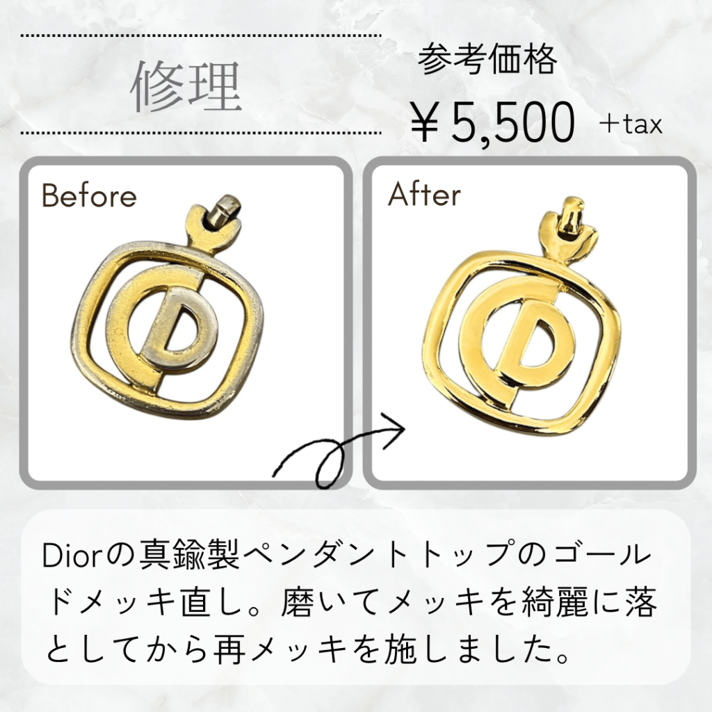 剥がれかけたメッキを1度綺麗に磨いて落としてから、K18ゴールドメッキ加工をして、元通りに繋ぎ直ししました。