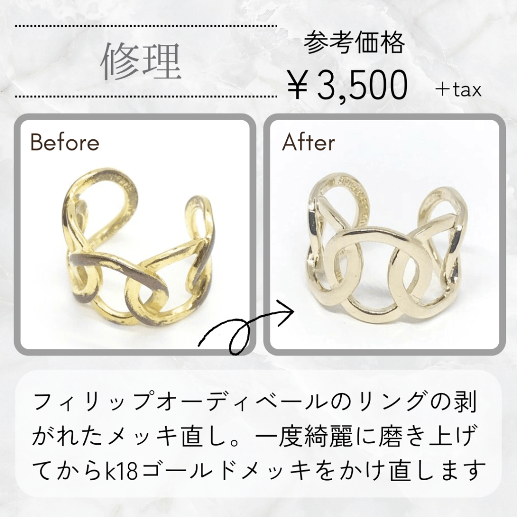 剥がれかけたメッキを1度綺麗に磨いて落としてから、下地処理をし、ロジウムメッキ加工をします。